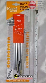 | ชุดประแจแอล Torx ทอร์ค ดอกจีบ KOCHE [ โคเช่ ] 9 ชิ้น / ชุด TORX [ STAR ] L-WRENCH SET 9 ชิ้น/ชุด [ T10 - T50 ] ## แบบมีรู [ ยาว ] - ราคา 560 บาท / ชุด ## ของแท้มาตรฐาน ญี่ปุ่น ## สินค้าของแท้ 100% หากรับสินค้าแล้วตรวจสอบว่าเป็นของปลอมยินดีคืนเงิน