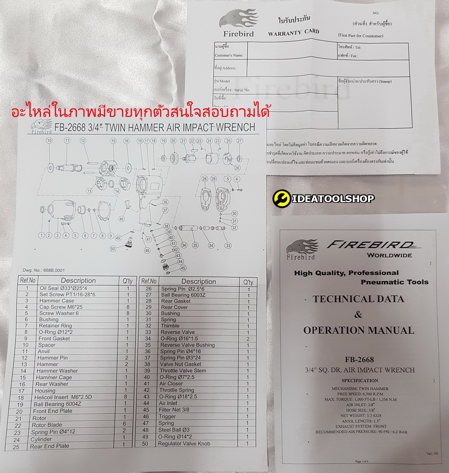รับประกันอะไหล่ 1 ปี [ หลังจาก 1 ปี มีบริการอะไหล่ มีขายแยกทุกชิ้น อาทิเช่น ลูกตี ใบพัด แกนบล็อกลม ไกยิง ]