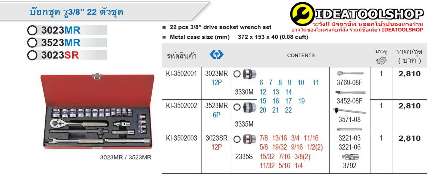 ประกอบด้วย ลูกบ๊อกสั้น 6 และ 12 เหลี่ยม ขนาด 3/8 เบอร์ 7/8 , 13/16 , 3/4 , 11/16 , 5/8, 19/32, 9/16, 1/2(2pcs) , 15/32, 7/16, 3/8, 11/32, 5/16, 1/4(2pcs)