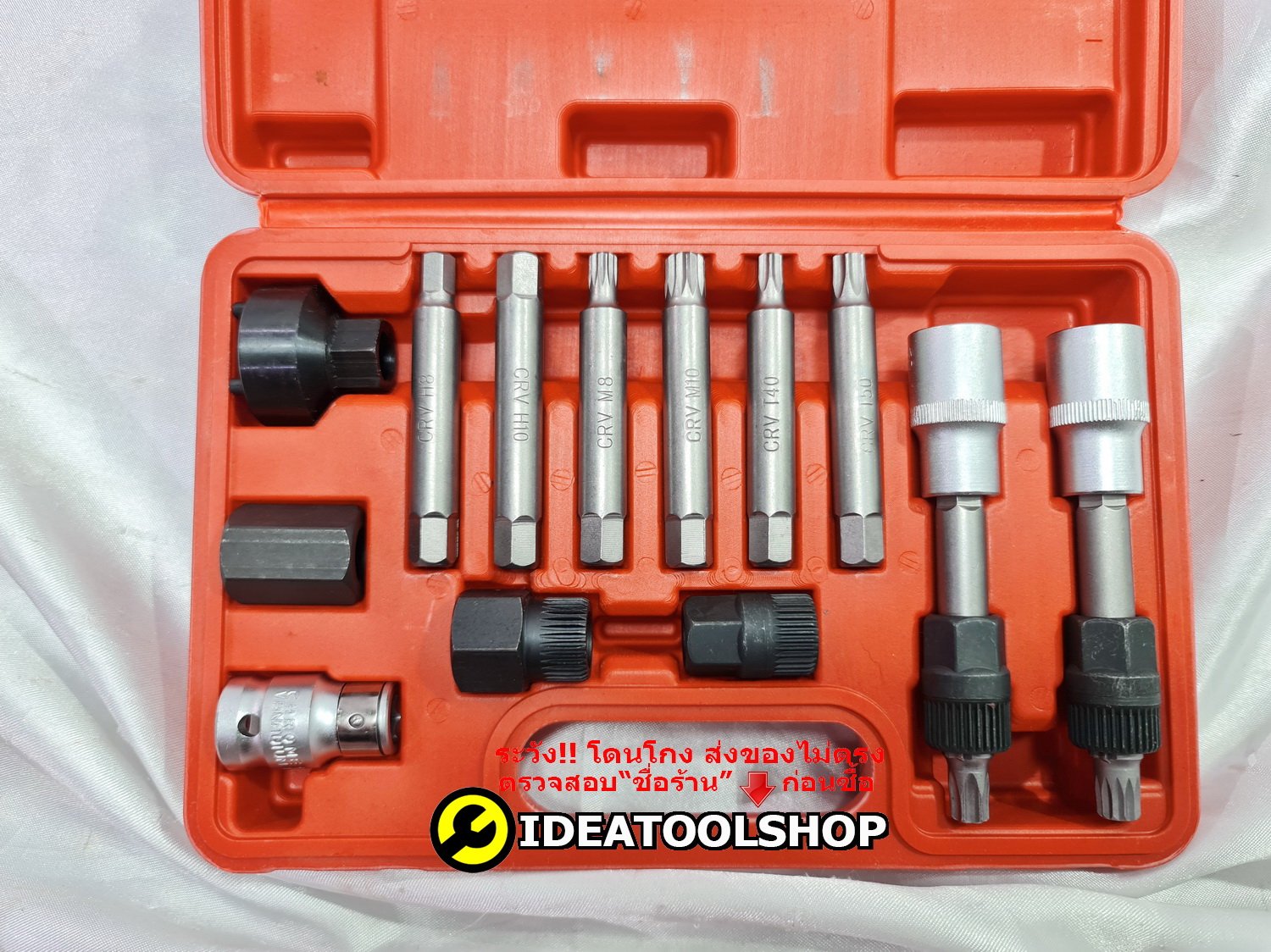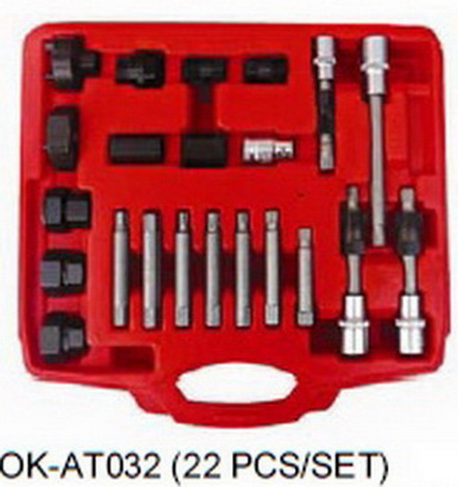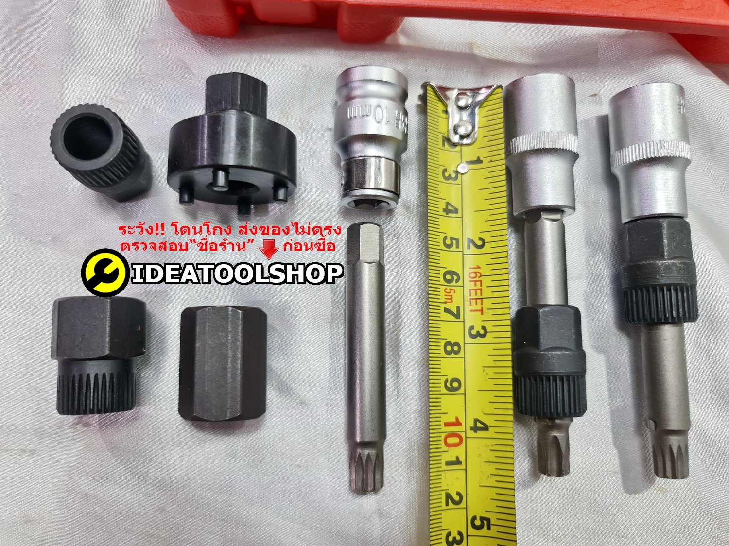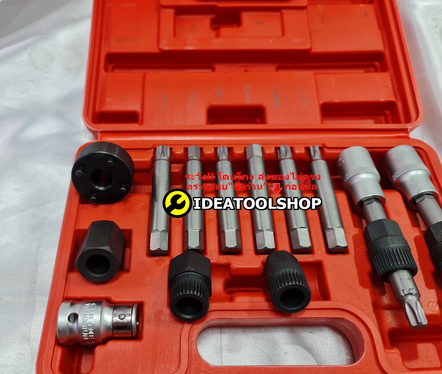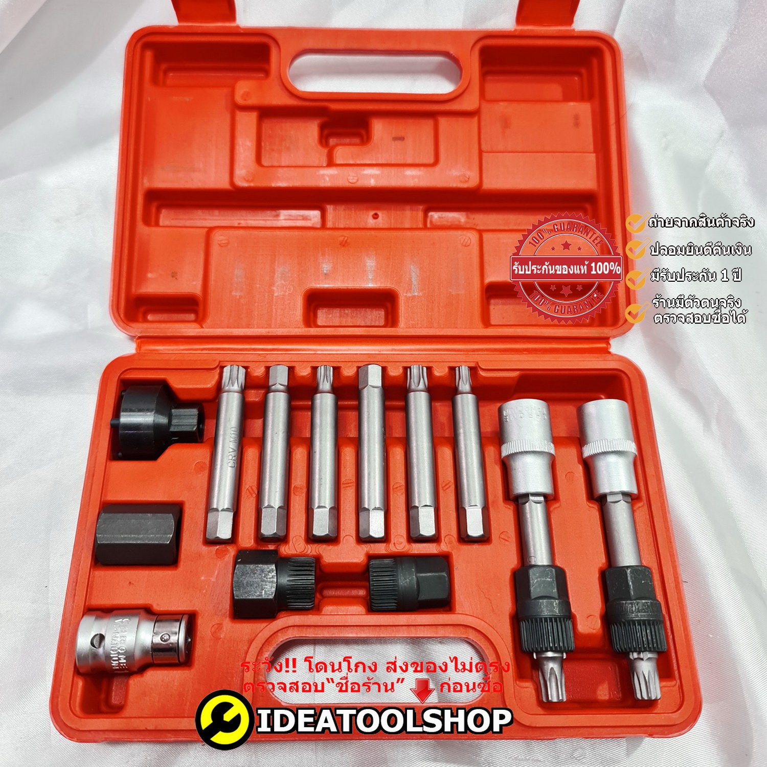 ชุดถอดมู่เล่ย์ไดชาร์จ 22 ชิ้น ซ่อม ไดชาร์จ ถอดมู่เลย์ อู่ซ่อมรถยนต์ ขนาดกระทัดรัด ใช้งานง่าย จับถนัดมือ ผลิตจากเหล็กแข็ง CR-V แข็งคุณภาพดี กระเป๋า เคส อย่างดี สวยงาม จัดเก็บ เป็นระเบียบ พกพาสะดวก Applications: Removing Pulley on vehicle 1PC-T50x113mm 33 TEETHS 1/2" COMBINATION SOCKET 1PC-M10x113mm 33 TEETHS 3/2" COMBINATION SOCKET 1PC-M10x80mm 33 TEETHS SPLINE COMBINATION SOCKET 3PCS-SOCKET BIT:33T-15x17.9mm, 33T-15x19.4mm, 33T-22x19.4mm 5PCS-HEX ADAPTORS:17mm, 22mm, 22x28mm, 19x28mm, 21x28mm 1PC-35mm 4 PIN ROUND ADAPTER 1PC-38mm 3 PIN HEX ADAPTER 1PC-1/2" 10mm HEX ADAPTER BITS:10mm HEX, T40x75mm, T50x75mm, BITS:M10x65mm SPLINE, M8x75mm SPLINE, BITS:M10x75mm SPLINE, 8x75mm Hex, 10x75mm HEX, BITS:10x75mm