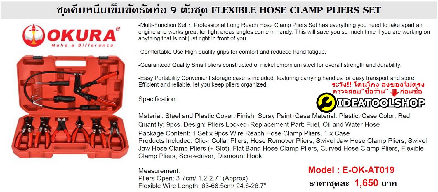 ชุดคีมหนีบเข็มขัดรัดท่อ OKURA [ E-OK-AT019 ] คีมถ่าง ถอด กิ๊ปรัดท่อน้ำ เข็มขัดรัดท่อน้ำมัน คีมหนีบเข็มขัดรัดท่อ กิ๊ป