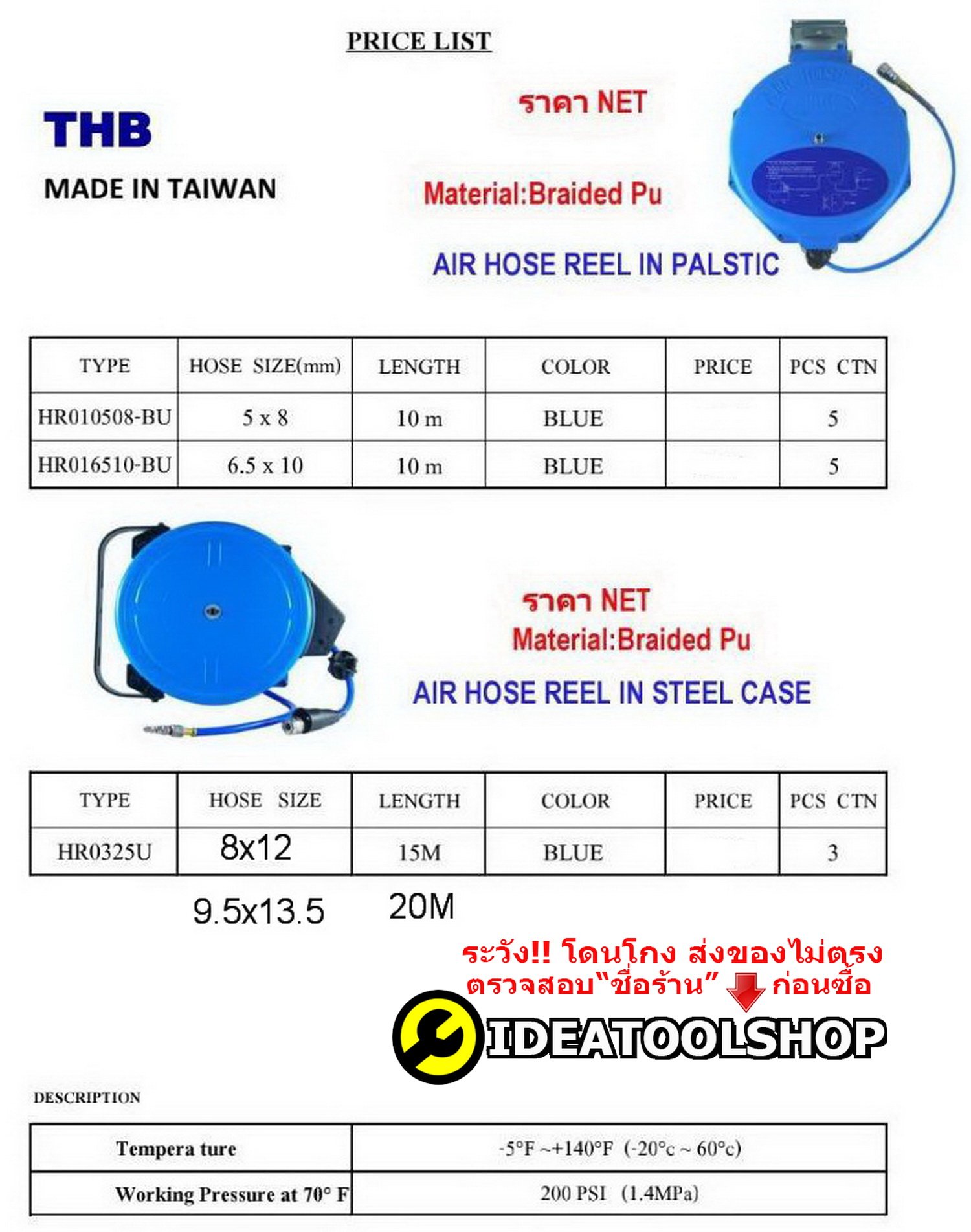 สายลมตลับ THB [Taiwan!!!] มี4ขนาด 5x8 6.5x10 8x12 9.5x13.5 ตลับโรลสายลม แบบมีใยถัก ตลับเก็บสายลม โรลสายลม สายลม โรล เมตร