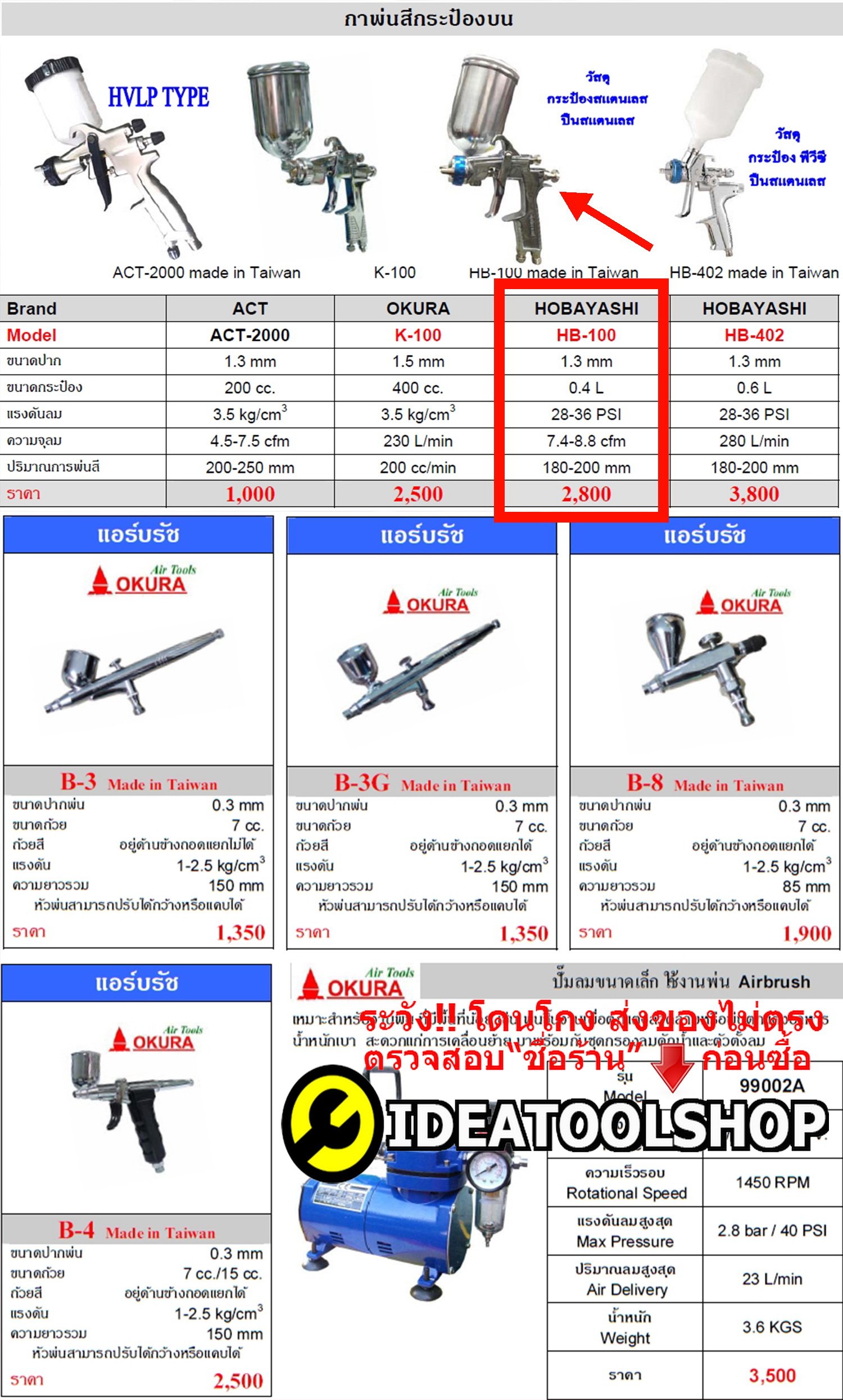 ไต้หวันแท้!!! กาพ่นสี HOBAYASHI HB-100 กาพ่นสีรถยนต์ เครื่องพ่นสี กาบน กาพ่นสีหงาย ถ้วยข้าง ปืนสเปรย์เพ้นท์สี กระป๋อง บน