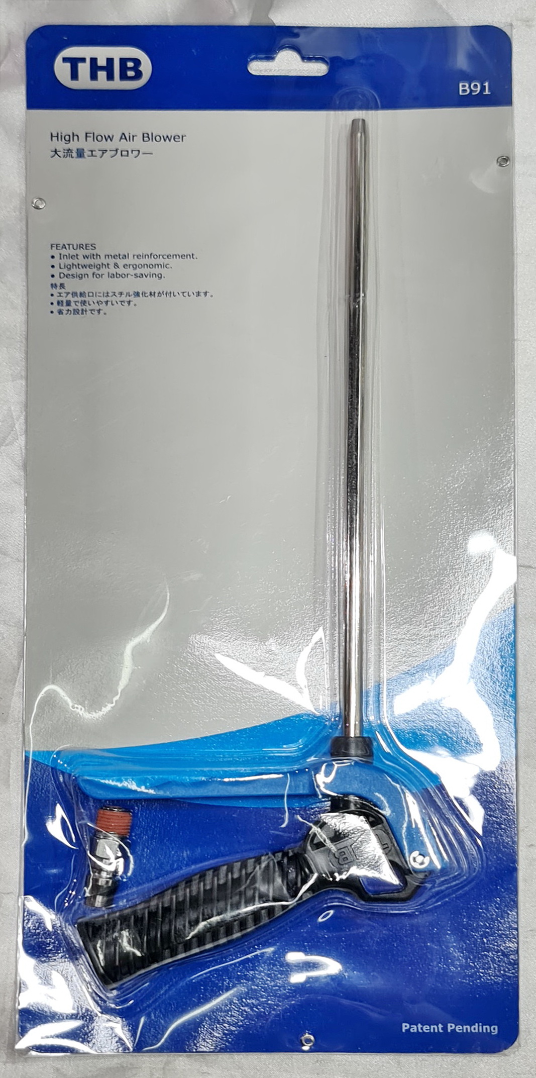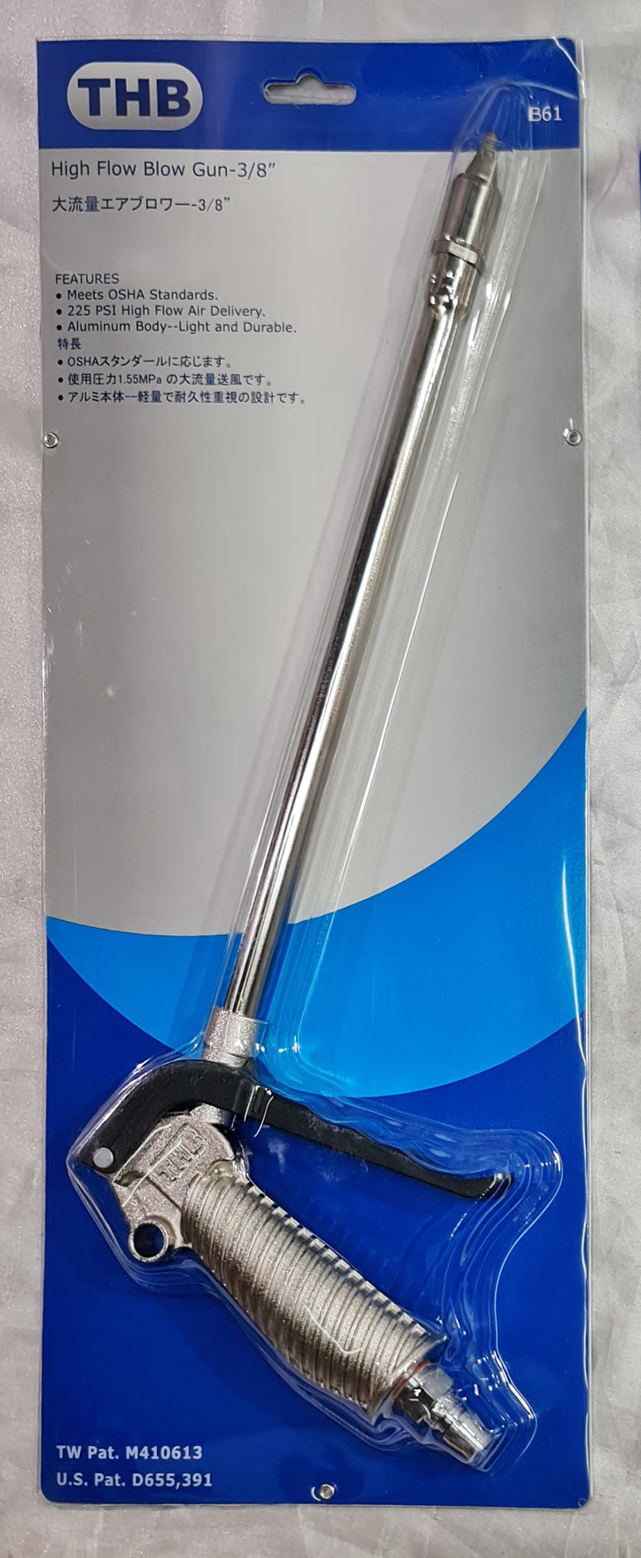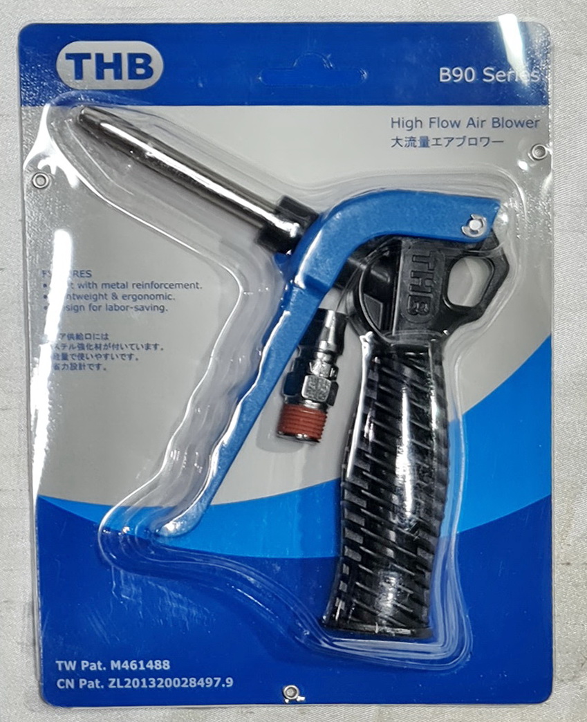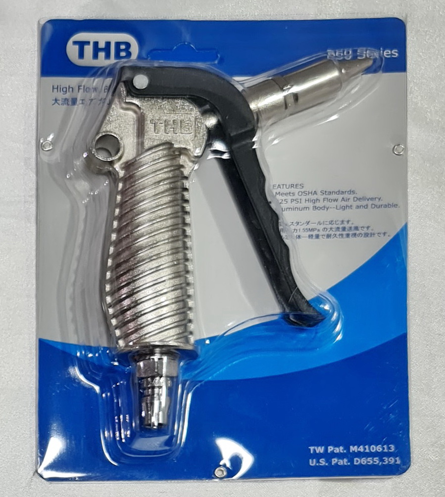 คุณสมบัติ ปืนเป่าลม ปืนฉีดฝุ่น ปืนเป่าฝุ่น THB No.B60 ปืนลม Air blower gun THB No.B60 มาตรฐาน OSHA ผลิตในไต้หวัน (made in Taiwan) ข้อมูลจำเพาะ - รูเกลียว 3/8” - Max Pressure 225 psi (16 ksc.) - Air Flow 1,500 l/min at 10 ksc. - ตัวทำจากอลูมินั่ม น้ำหนักเบา ทนทาน