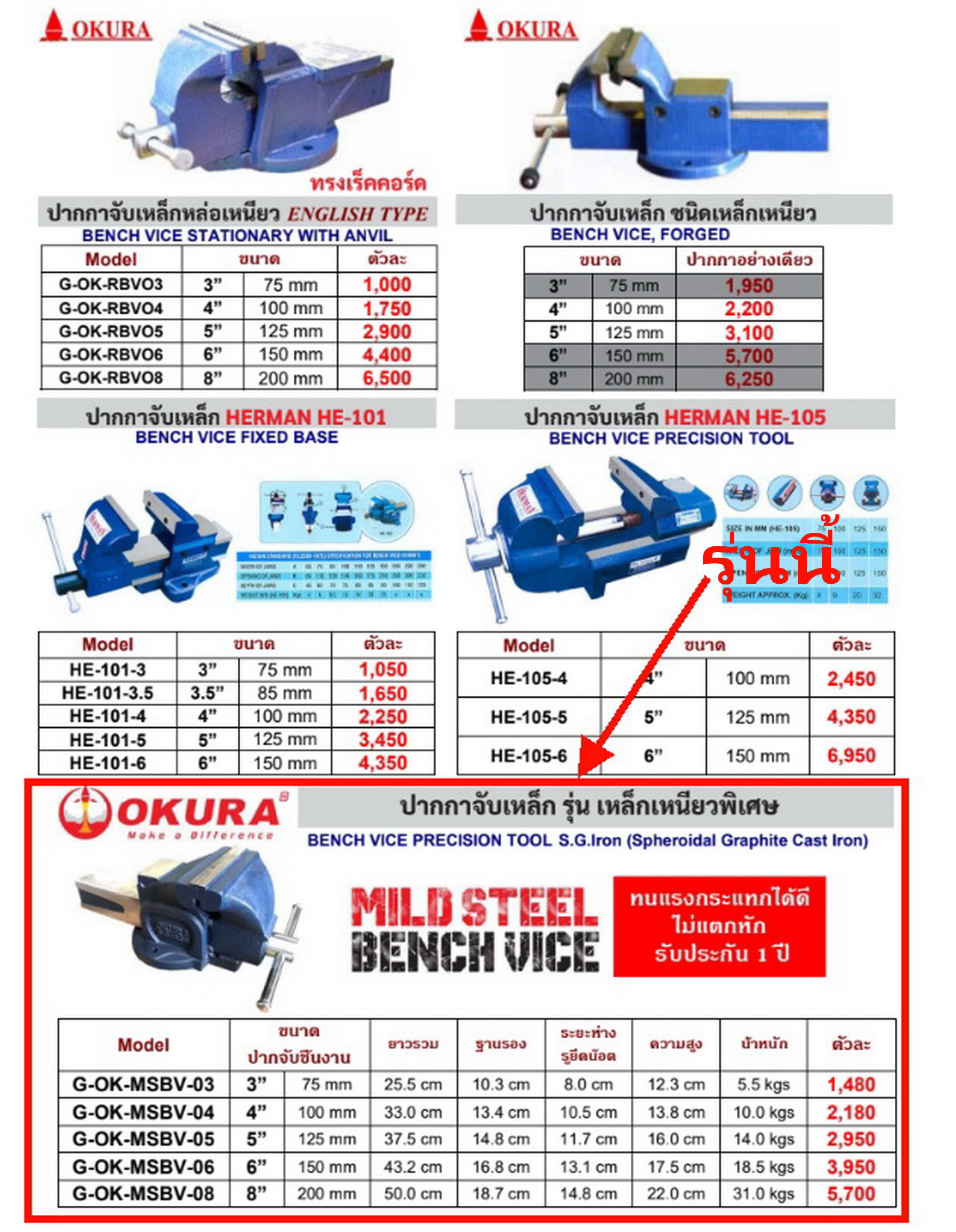 ปากกาจับชิ้นงาน OKURA [รุ่นเหล็กเหนียวพิเศษ] ทนแรงกระแทกได้ดี ไม่แตกหักรับประกัน 1 ปี ปากกาจับเหล็ก ขนาด 3 4 5 6 8 นิ้ว